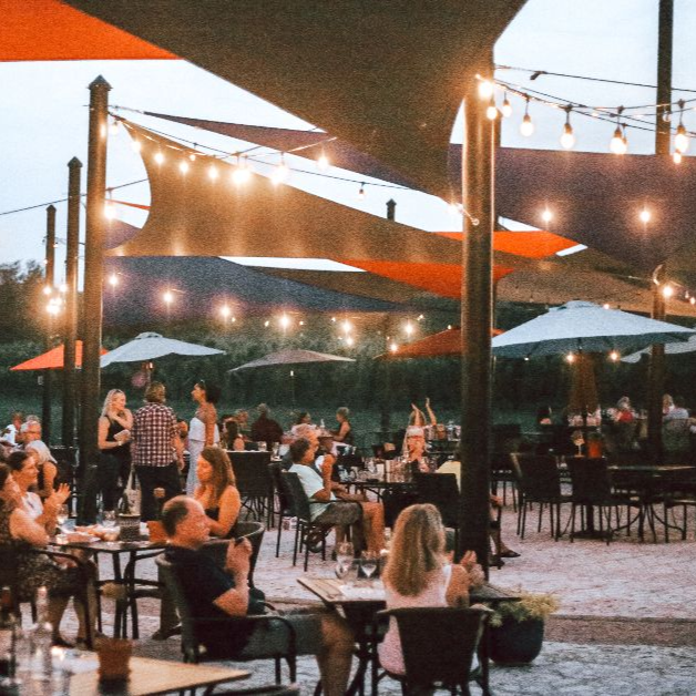 Our Tasting Room, which can accommodate 150 people, features sweeping views of the vineyards and was built using a multitude of materials grown or gathered on the farm, including wood, stone, straw, and clay. The interior of the building includes a hand-crafted bar, two inviting fireplaces, one-of-a-kind curly maple tables, ADA-compliant bathrooms and 1,150 square feet of floor space. The facility also includes a delightful courtyard furnished with tables and chairs, speakers, and strung lights, making it the perfect location for large gatherings.