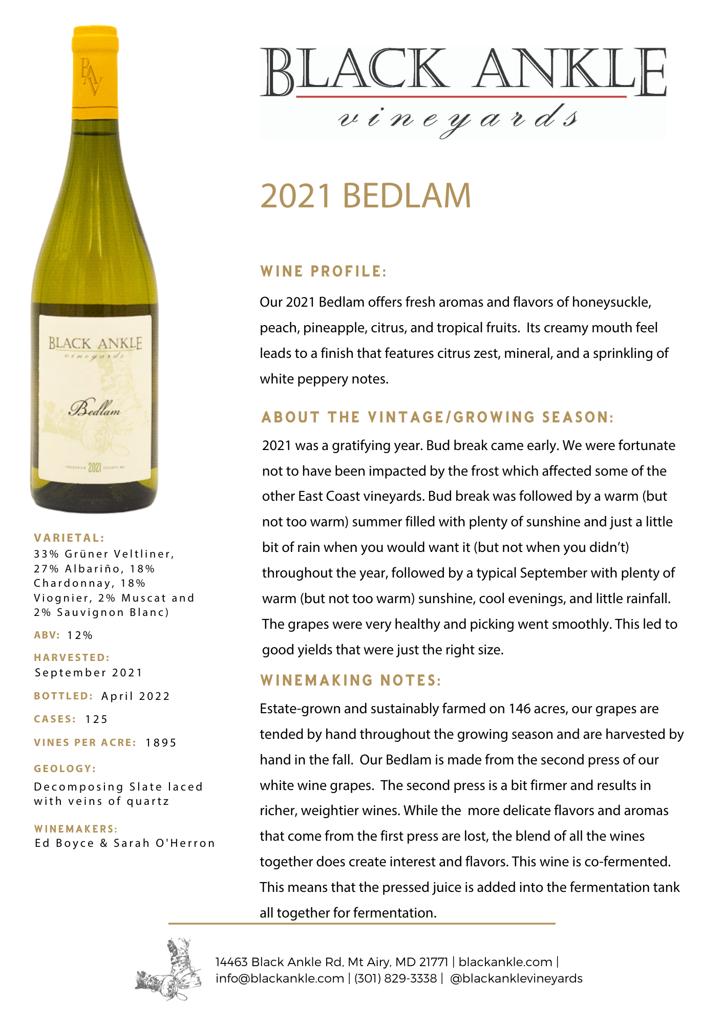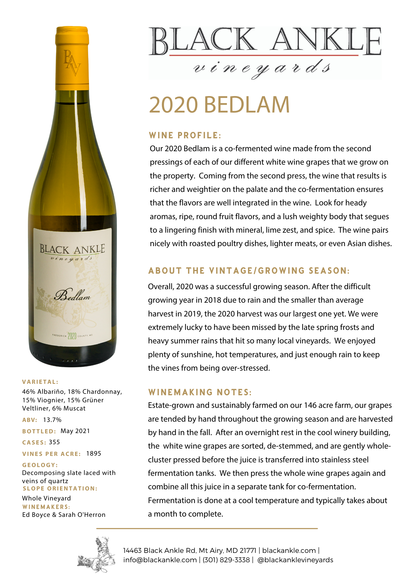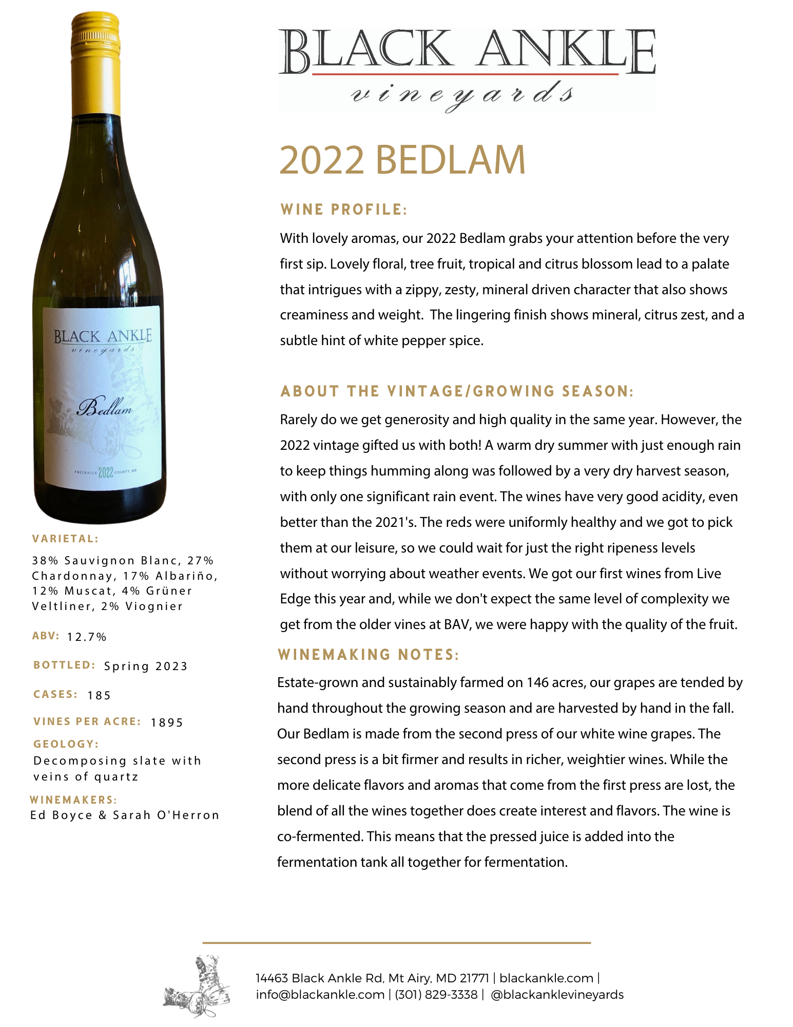 bedlam is our unique white blend which in most vintages includes a little bit of every white varietal we grow. it is smooth and flavorful, with a great mouthfeel and pairs well with rich and creamy foods