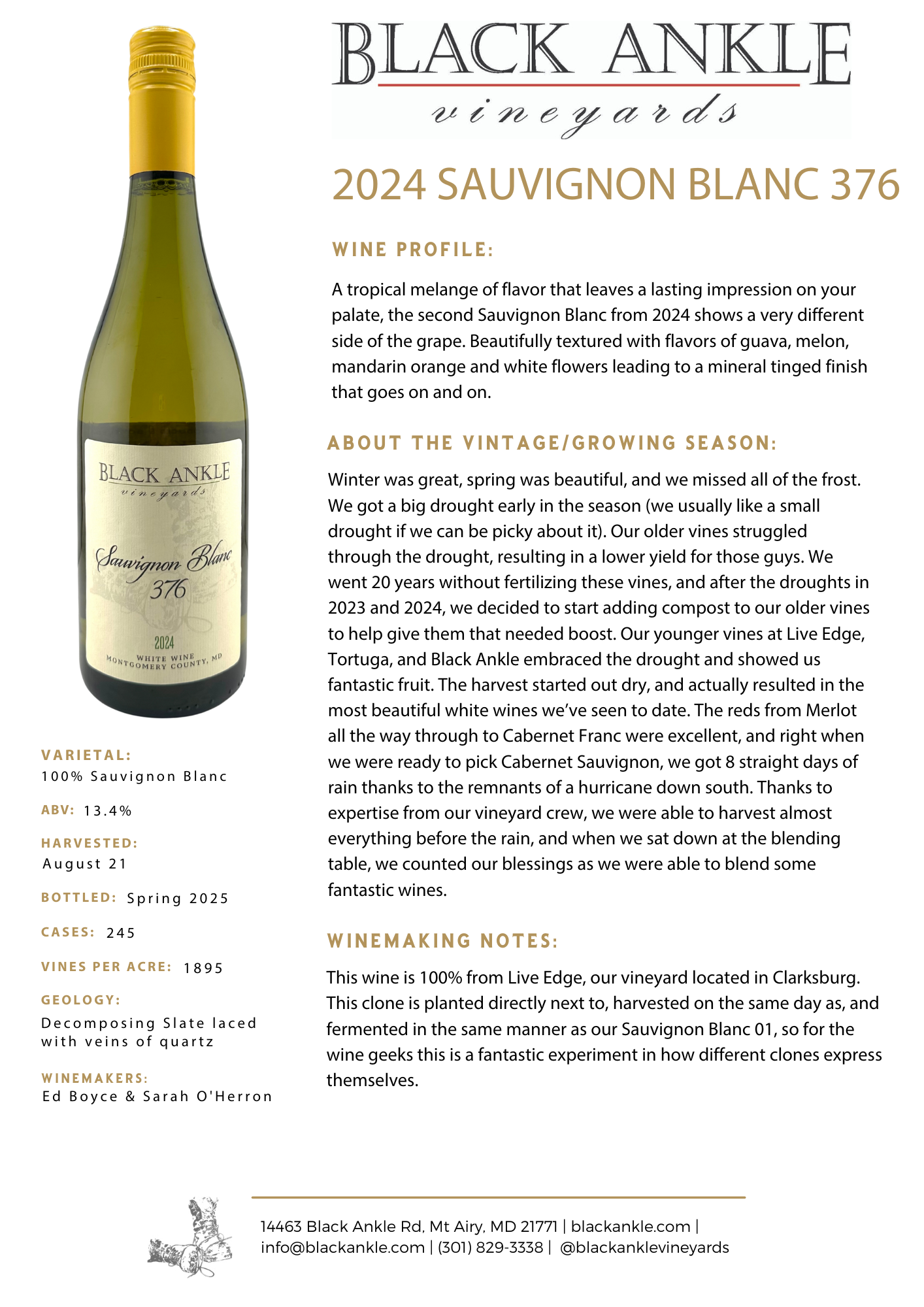 Our latest release, the 2024 Sauvignon Blanc 376 is available for purchase in the Tasting Room and online.